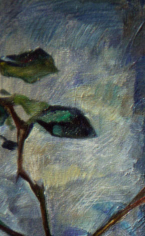 But what looking at this boundary closely calls to attention is that there are details that are mirrored which the mirror could not possibly reflect - note the elongated diamond of brown below the petals of the rose. In other words the details below a certain threshold are no longer representational in any sense - but are created out of a texture of their own. This texture follows its own rules and its nature is clearly important - since every inch of every canvas has details of a similar nature - they dictate every object and the space that in encompasses, the texture of light and the creation of distance or its negation.
