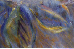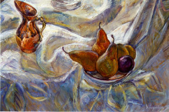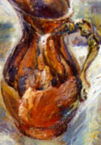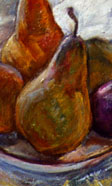 Because this is so, real ambiguity is possible in her paintings. Let me take a simple example from this painting. One one of the pears shown here, there seems to be a face, the face of a woman who looks outward - is it put there intentionally, in imitation of the pitcher - or is it just happenstance of the brush work? Because the world of the painting is sufficiently rich - this ambiguity is possible - there are clearly layers of detail which are not intended to be images - however they exist and are sufficiently complex that the artist could have reached out and made this detail intentionally - or not. Since there is a self-logic to the whole of the painting is strong enough - and contains both details of the brush work which are images and details which are not but have the same aspect and are created by the same means, this ambiguity is possible.
