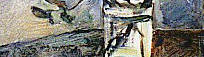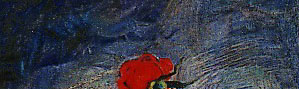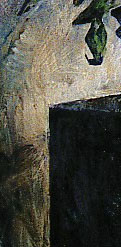 This alone is technical virtuosity - but notice that the effect of ambiguity is used to focus attention on a particular part of the painting - one which under normal circumstances you would not linger over - to draw the eye away from the bright read centrally located roses, away from the large central light area of the mirror - and towards other regions of the painting. This creates a tension in the eye - no matter where it focuses - there seem to be other colours and shapes which are strong enough to make you want to look at them. It is in this way that we normally come to some sense of rest in a space - we look at one point and then look at everything which seems not to fit with it, casting our eye about, resolving the differences, until we have a mental picture of a scene which can be used to fill in all of the details. Occasionally a bit of shadow and convergence of shapes jumps out - or a motion peripheral to the centre of our focus. The eye jumps to this new place to determine what it is.